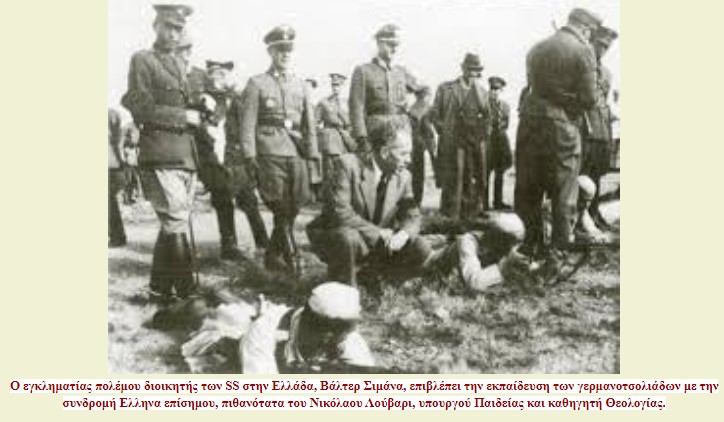 Οι αγαστές άλλωστε σχέσεις Γερμανών και ταγματασφαλιτών εγγράφονται και στο τηλεγράφημα (2/8/1944) του Heinrich Himmler προς τον ανώτερο αρχηγό των SS και της Αστυνομίας στην Ελλάδα αντιστράτηγο Walter Schimana και μέσω αυτού στον Διονύσιο Παπαδόγγονα των Ταγμάτων Ασφαλείας Πελοποννήσου, όπου χαρακτήριζε τα τελευταία «πιστά και γενναία τμήματα Ελλήνων εθελοντών».