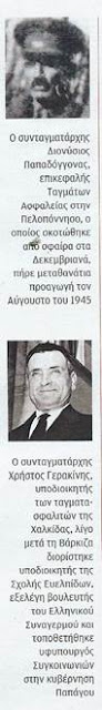 22 Ενδεικτικό της μεταπολεμικής αντιμετώπισης των Ταγμάτων Ασφαλείας από φιλελεύθερους αστούς πολιτικούς είναι ότι στις αρχές Οκτωβρίου 1944 ο Π. Κανελλόπουλος, σύμφωνα με δικά του λεγόμενα, κατά την παράδοση του Τάγματος Ασφαλείας Τρίπολης (υπό τη διοίκηση του Διον. Παπαδόγγονα) ξαναβρίσκει «τους παλιούς πολιτικούς του φίλους» και αναφέρεται στους αξιωματικούς των Ταγμάτων Ασφαλείας ως «πατριώτες αξιωματικούς», βλ. Κανελλόπουλος, ό.π., σ. 654-663.
