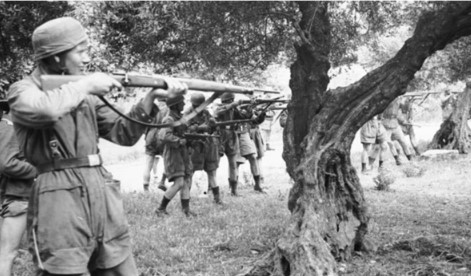 Τρομοκρατία ενάντια στον άμαχο πληθυσμό: Γερμανοί αλεξιπτωτιστές τουφεκίζουν σε μια «εκκαθαριστική επιχείρηση», στις 2 Ιουνίου 1941, αμάχους στο χωριό Κοντομαρί Χανίων. Το χωριό στη συνέχεια καταστράφηκε. Το πόσοι άνδρες δολοφονήθηκαν δεν είναι γνωστό. Σε μια αναμνηστική πλάκα καταγράφονται 26 ονόματα.