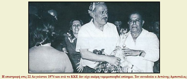 Μετά την πτώση της χούντας επιστρέφει στην Ελλάδα στις 22 Αυγούστου 1974 και η μη σύλληψή του ισοδυναμεί με de facto νομιμοποίηση του ΚΚΕ. Η de jure θα έλθει στις 23 Σεπτεμβρίου 1974. Με τον Χαρίλαο Φλωράκη στην ηγεσία το κόμμα κατορθώνει να συμβάλει στη στερέωση της κοινοβουλευτικής δημοκρατίας και να εξασφαλίσει την ηγεμονία στον χώρο της κομμουνιστικής Αριστεράς.