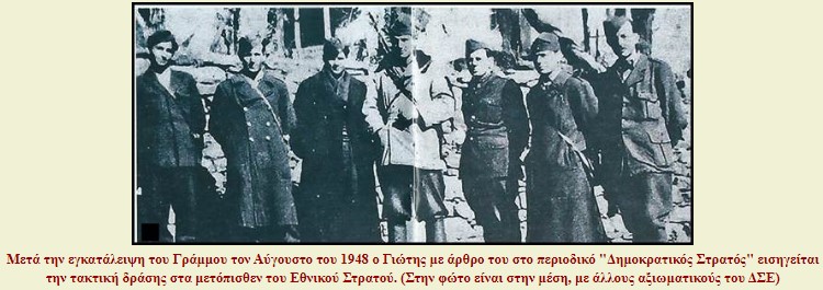 Μετά την εγκατάλειψη του Γράμμου τον Αύγουστο του 1948, ο ΔΣΕ βρέθηκε σε δυσμενή στρατηγική θέση, την οποία προσπάθησε να ανατρέψει τον χειμώνα του 1948-49 με επιθέσεις κατά του εχθρού σε διάφορα αστικά κέντρα. Στις συνθήκες αυτές ο Γιώτης, με άρθρο του στο περιοδικό «Δημοκρατικός Στρατός» τον Φεβρουάριο του 1949, προσπαθεί να περιγράφει τα καθήκοντα των τμημάτων του ΔΣΕ στη νότια Ελλάδα όπως διαμορφώνονταν από την ασφυκτική πίεση των κυβερνητικών δυνάμεων στο κύριο μέτωπο.