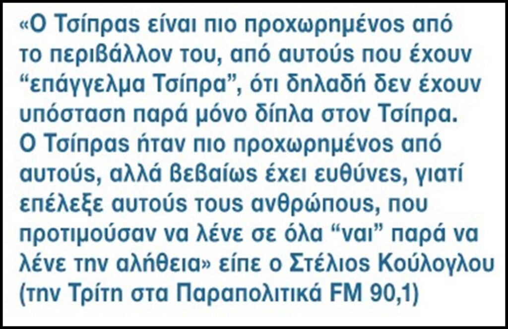 Δεν θα μπούμε στην διαδικασία να σχολιάσουμε τα δυο σημερινά πρωτοσέλιδα -από τα “ΝΕΑ” και την “Δημοκρατία”- που εκμεταλλεύονται τις δηλώσεις του για να ασκήσουν κριτική στον ΣΥΡΙΖΑ.