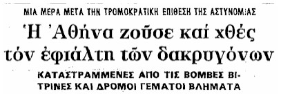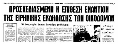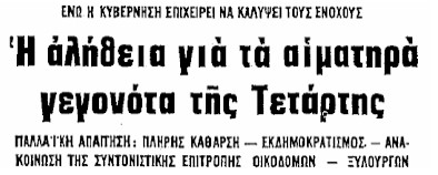 «Οι δρόμοι της πρωτεύουσας βάφτηκαν χθες στο αίμα. Και βάφτηκαν λίγες ώρες προτού ο κ. Καραμανλής εκφωνήσει τον πανηγυρικό του και αρχίσουν οι προγραμματισμένες εορταστικές εκδηλώσεις για την πρώτη επέτειο της απομάκρυνσης της χούντας. Γεγονός σημαδιακό που προειδοποιεί και επιβεβαιώνει ακόμα πιο έντονα ότι η νεοφασιστική χούντα, που κατατυράννησε το λαό εφτά και πάνω χρόνια, έχει αφήσει αρκετά πλοκάμια στα σώματα ασφαλείας και στον άλλο κρατικό μηχανισμό και ότι υπάρχουν σκοτεινές δυνάμεις που νοσταλγούν τη λαομίσητη δικτατορία. Την ευθύνη και για τα χτεσινά αιματηρά γεγονότα την φέρνει η κυβέρνηση, που αρνήθηκε να ικανοποιήσει το επιτακτικό αίτημα του λαού για αποχουντοποίηση και εκδημοκρατισμό. Μάταια προσπαθεί να ρίξει την ευθύνη στους οικοδόμους που ασκούσαν νόμιμο δικαίωμα και που αποφάσισαν να διαλυθούν για να αφαιρέσουν κάθε πρόσχημα όξυνσης της κατάστασης. Η συνέχιση των απρόκλητων επιθέσεων της αστυνομίας ως αργά το βράδυ στους κεντρικούς δρόμους της πρωτεύουσας και ο αναίτιος τραυματισμός ανύποπτων πολιτών θύμισε προβοκατόρικες εκδηλώσεις που προετοίμασαν το έδαφος για την επιβολή της φασιστικής δικτατορίας.» [2]