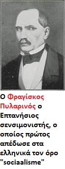 Η πρώτη ελληνική απόδοση του όρου «socialisme»» οφείλεται στον Επτανήσιο «σενσιμονιστή» Φραγκίσκο Πυλαρινό, που νεκρολογώντας τον Κοραή (1833) συνόψισε τη «φιλοσοφική αποστολή» του 19ου αιώνα στο τρίπτυχο: ελευθερία, ισότης, κοινωνισμός.