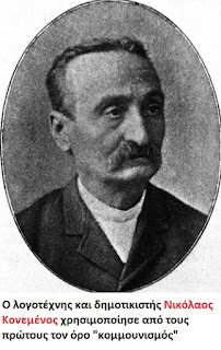 Επίσης ο όρος «communisme» θα μεταφερθεί αρκετά νωρίς ως «κομμουνισμός» (Κ. Λομβάρδος, «Δύο επιστολαί προς τον κ. I Μομφερράτον», «Η Φωνή του Ιονίου», 27/9/1858,1), ως «κωμουνισμός» ([Κ.Κ. Φιλόπουλος], «Οι νέοι κοινωνιολόγοι», «Φορολογούμενος», 20/5/1877,2) κατά τη συστοιχία της «κώμης» με την «commune» και ως «κοινοκτημονική θεωρία» ή «κοινοκτημοσύνη» που αποσκοπεί στην κατάργηση «πόσης χωριστής περιουσίας» και εις την κοινοποίηση/ των υπάρχοντάν» (Ευταξίας, «Κοινοκτημονικαί», 1876).