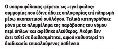 Εκτός αυτού ο συγκεκριμένος υπαρχιφύλακας φέρεται ως «εγκέφαλος» συμμορίας που έδινε άδειες οπλοφορίας επί πληρωμή μέσω σκοπευτικού συλλόγου. Μάλιστα, ούτε καν έχει τεθεί σε διαθεσιμότητα, αφού καθυστερεί τη διαδικασία επικαλούμενος ασθένεια. Ξέρετε τώρα … τα γνωστά σε τέτοιες περιπτώσεις.