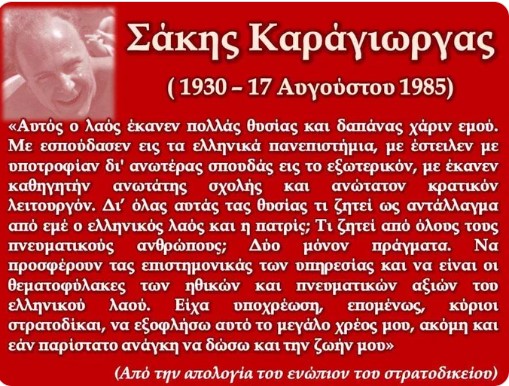 Ηταν σαν σήμερα 17 Αυγούστου 1985 όταν μετά από μετεμφραγματική επιπλοκή, απεβίωσε ο αγωνιστής Σάκης Καράγιωργας. Εχει μείνει ιστορική η “απολογία” του, στις 7 Απριλίου 1970. στους στρατοδίκες στην δίκη της αντιστασιακής οργάνωσης “Δημοκρατική Αμυνα” στην οποία υπήρξε ιδρυτικό και καθοδηγητικό της μέλος.