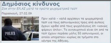 «Πριν καλά – καλά αρχίσουν τα ψυχομετρικά τεστ για τους αστυνομικούς τρεις από αυτούς έχουν κριθεί από τους ψυχολόγους ότι “κακώς φέρουν όπλο”. Το ανησυχητικό είναι ότι από τα τεστ έχουν περάσει μόλις 50 αστυνομικοί, οι οποίοι υπηρετούν κυρίως σε τμήματα στο κέντρο της Αθήνας».
