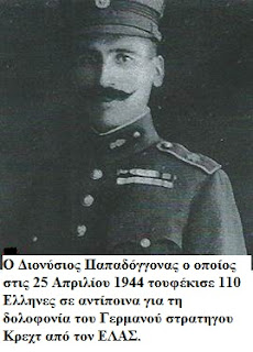 Στις 25 Απριλίου 1944 τουφεκίστηκαν από τον Παπαδόγγονα 110 Ελληνες πολίτες, σε αντίποινα για τη δολοφονία του Γερμανού στρατηγού Κρεχ από τον ΕΛΑΣ.