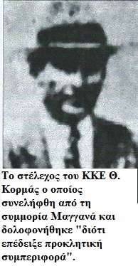 Στην είσοδο της Θούριας η συμμορία Μαγγανά συνέλαβε «τον κατερχόμενον δι’ αυτοκινήτου εξ’ Αθηνών εις Καλάμας δικηγόρον και στέλεχος του ΚΚΕ, Θ. Κορμόν, κομιστήν εντολών της ηγεσίας του ΚΚΕ, τον οποίον, λόγω της προκλητικής στάσεώς του, εξετέλεσε επί τόπου». 25
