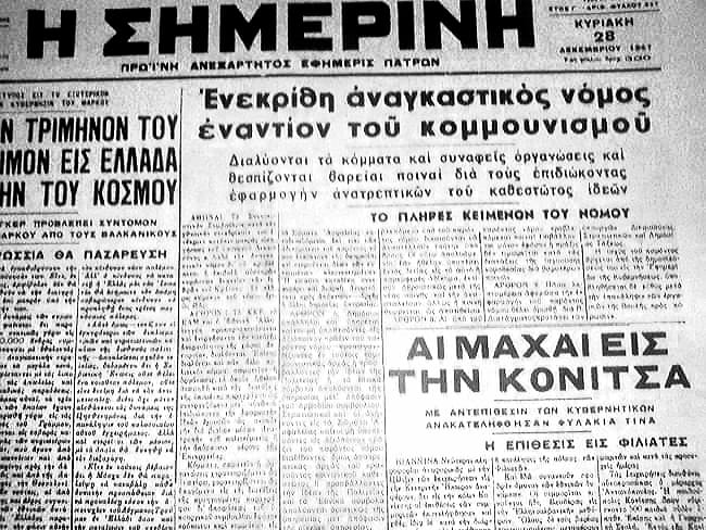 Ο νόμος αυτός, που εκδόθηκε παρά το γεγονός ότι δε συνεδρίαζε εκείνες τις μέρες η Βουλή, έθετε εκτός νόμου το ΚΚΕ, το ΕΑΜ και την Εθνική Αλληλεγγύη, απαγόρευε την κυκλοφορία της τελευταίας νόμιμης εφημερίδας του κόμματος, «Ρίζος της Δευτέρας», νομιμοποιούσε τα πογκρόμ της αστυνομίας των τελευταίων ημερών κι άνοιγε ένα νέο γύρο διώξεων, που κανείς δεν μπορούσε να φανταστεί τα όριά τους, παρά το ότι ο λαός είχε συσσωρευμένη εμπειρία από παρόμοιες καταστάσεις.