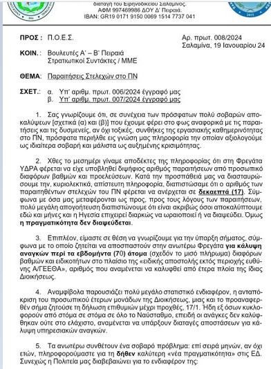 Τώρα κυκλοφορεί η πληροφορία ότι στάλθηκε στην ηγεσία του Ναυτικού Σώματος διψήφιος αριθμός παραιτήσεων -17-, συμπεριλαμβανομένων, διάφορων βαθμών και προελεύσεων, από το πλήρωμα της φρεγάτας «ΥΔΡΑ».