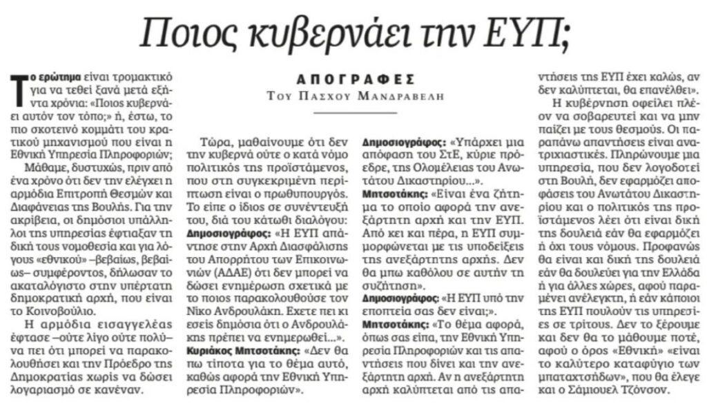 Είναι αξιοσημείωτο που ένας δημοσιογράφος, ο Πάσχος Μανδραβέλης, που συνήθως είτε σαν μαρκουτσοφόρος στην τηλεόραση του Σκάι είτε σαν καλαμαράς στην «Καθημερινή» χύνει συνέχεια τα εμέσματά του σε κάθε εργατική κινητοποίηση ενώ παράλληλα στηρίζει όλες τις αντιλαϊκές κυβερνητικές πολιτικές να κάνει τέτοια ολομέτωπη επίθεση στην Ν.Δ και προσωπικά στον Κυριάκο Μητσοτάκη στο σημερινό του άρθρο στην “Καθημερινή”. Λέει με άλλα λόγια, αυτά που υπογραμμίζαμε κι εμείς, πριν λίγες μέρες στην ανάρτηση μας που τιτλοφορούσαμε ΕΥΠ: “Κράτος εν κράτει”