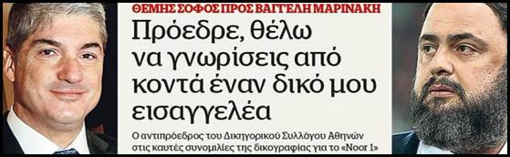 Τυχαίνει (;) λοιπόν, την υπεράσπιση του Μαρινάκη να την είχε αναλάβει ο αντιπρόεδρος του Δικηγορικού Συλλόγου Αθήνας, Θέμης Σοφός. Είχε αποκαλυφθεί, λοιπόν μια άκρως ενδιαφέρουσα συνομιλίες -έχει υποκλαπεί νόμιμα και περιέχεται στην συγκεκριμένη δικογραφία– που είχε σχηματιστεί για τους κατηγορουμένων για την υπόθεση του “Noor1”. Απ’ αυτή πληροφορούμαστε ότι ο αντιπρόεδρος του ΔΣA προτείνει και κανονίζει συνάντηση με “δικό του”, όπως λέει, εισαγγελέα σε γνωστό παραλιακό κέντρο. (Προφανώς μεταξύ εδεσμάτων να καθορίσουν και την “ταρίφα”. Ξέρετε πώς γίνονται αυτές οι δουλειές…).