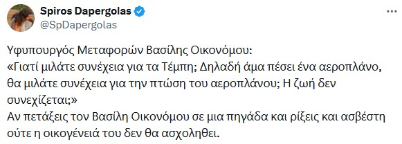 Οπως διαβάζουμε στο ρεπορτάζ της ΕφΣυν, ο Β. Οικονόμου, όχι απλώς αμφισβήτησε την παραλίγο τραγωδία στους Αγίους Αναργύρους, αλλά με χυδαιότητα ισχυρίστηκε, εμμέσως πλην σαφώς, ότι όσοι τρώνε ψωμί από τον σιδηρόδρομο δεν θα πρέπει να μιλάνε!