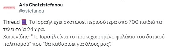 Δεν είναι λοιπόν περίεργο ότι ο Μητσοτάκης έσπευσε να μας ενημερώσει ότι στις διακοπές του διάβασε ένα βιβλίο του Χ. Χωμενίδη, ούτε το ότι -όπως μας πληροφόρησε η ιστοσελίδα του ελληνικού BDS– ο Χρήστος Χωμενίδης ήταν ένας από τους μόλις οχτώ διεθνείς συγγραφείς που πήγε στο Ισραήλ για να συμμετάσχει στο Διεθνές Φεστιβάλ Συγγραφέων του Ισραήλ. Μια σιωνιστική φιέστα που ήταν απροκάλυπτα αφιερωμένη «στην 7η Οκτωβρίου και τους ισραηλινούς στρατιώτες που επιχειρούν στη Γάζα».
