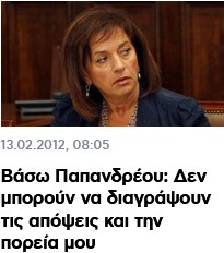 Είναι δεδομένο ότι η Βάσω Παπανδρέου γνώριζε πράγματα και καταστάσεις. Φυσικά όμως όλα τα πυρά της ήταν άσφαιρα και τα χρησιμοποιούσε για την δική της κομματική και πολιτική επιβίωση. Ολοι οι πολιτικάντηδες των αστικών κομμάτων λειτουργούν σαν καμόρα και δεν πρόκειται να βγάλουν τα άπλυτα τους στην φόρα. Απλώς «πιασάρικες» ήταν τέτοιες δηλώσεις και τις εκμεταλλεύτηκε εκτός των άλλων για να βρίσκεται στην επικαιρότητα η Βάσω Παπανδρέου όταν βρέθηκε στα αζήτητα της πολιτικής ζωής, καθώς είχε διαγραφεί από το ΠΑΣΟΚ γιατί δεν ψήφισε ένα μνημόνιο που είχε φέρει το ΠΑΣΟΚ.