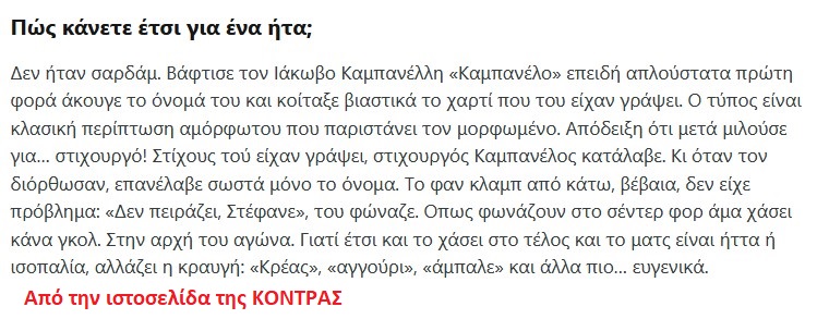 Κι εγώ πιστεύω πως, αν ζούσε ο σύντροφος Ιωσήφ, θα έστελνε τον Κασσελάκη κατευθείαν στο Διάολο, εκεί δηλαδή που θα τον στείλει κι ο κόσμος μετά τις εκλογές, να διαβάζουν μαζί ποιήματα του Καμπανέλλο, τα γνωστά καμπανέλλια (με 2 λάμδα). Κάθε συνωνυμία είναι σύμπτωση.