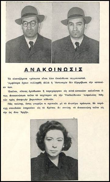 Η Ασφάλεια πανηγυρίζει εκδίδοντας «Ανακοίνωσις» με φωτογραφίες του Μπελογιάννη και της Παππά, στην οποία αναγραφόταν: «Τα εικονιζόμενα πρόσωπα είναι λίαν επικίνδυνοι κομμουνισταί. Αμφότερα έχουν συλληφθή αλλά η Αστυνομία δεν εξακρίβωσε την κατοικίαν των. Εκείνοι, οίτινες εμίσθωσαν ή παρεχώρησαν εις αυτά κατοικίαν καλούνταν όπως ανακοινώσωσι τούτο το ταχύτερον εις την Υποδιεύθυνσιν Ασφαλείας Αθηνών προς αποφυγήν βαρύτατων ευθυνών. Πας πολίτης, όστις γνωρίζει τι σχετικώς με τα ανωτέρω πρόσωπα, θα παράσχη σπουδαίαν υπηρεσίαν εις το Κράτος αν σπεύση να ανακοινώση τούτο εις την ως άνω Αρχήν».