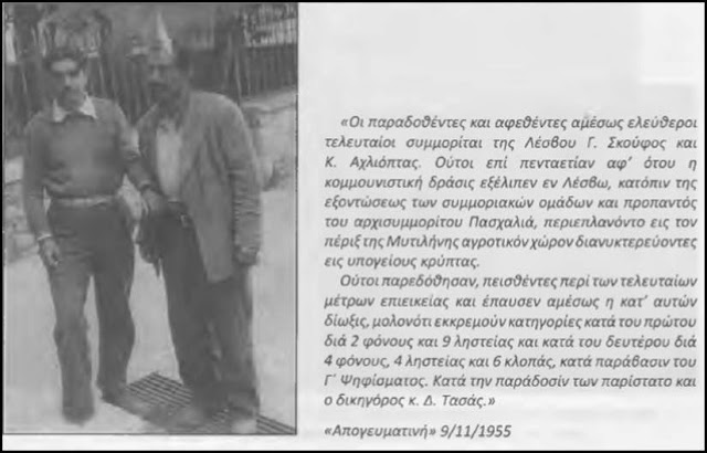 Ο τελευταίος αντάρτης του ΔΣΕ του νησιού ήταν ο Σκούφος και παραδόθηκε μαζί με το σύντροφο του τον Αχλιόπιτα ανήμερα της γιορτής για την απελευθέρωση της Μυτιλήνης, 9 Νοέμβρη του ’55.