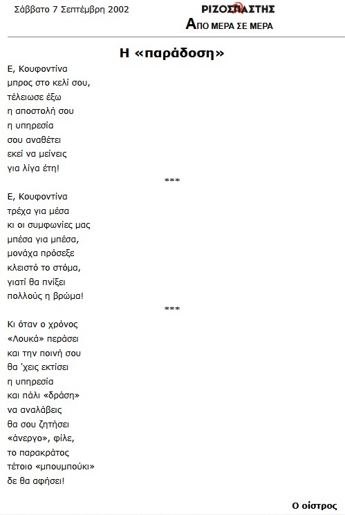 Και κάτι ακόμα. Μέχρι σήμερα και αντίθετα με τις προβλέψεις του “ποιητή” του Ριζοσπάστη, ο επαναστάτης Δημήτρης Κουφοντίνας εξακολουθεί να σαπίζει στα μπουντρούμια του Ελληνικού κράτους.