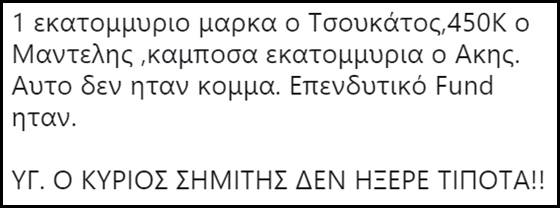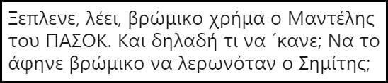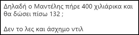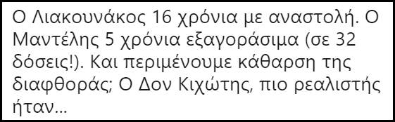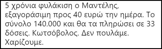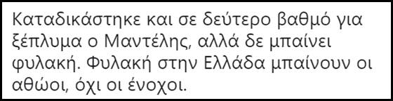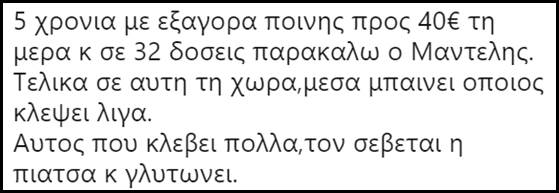 Πριν σας δώσουμε μια γεύση απ’ τα σχόλια που αναφέραμε, να υπενθυμίσουμε, ότι ο Μαντέλης δεν κάθισε ούτε μια μέρα φυλακή, -δεν είναι ο Νίκος Ρωμανός- ενώ δήλωσε αθώος χαρακτηρίζοντας την μίζα που πήρε “χορηγία”.
