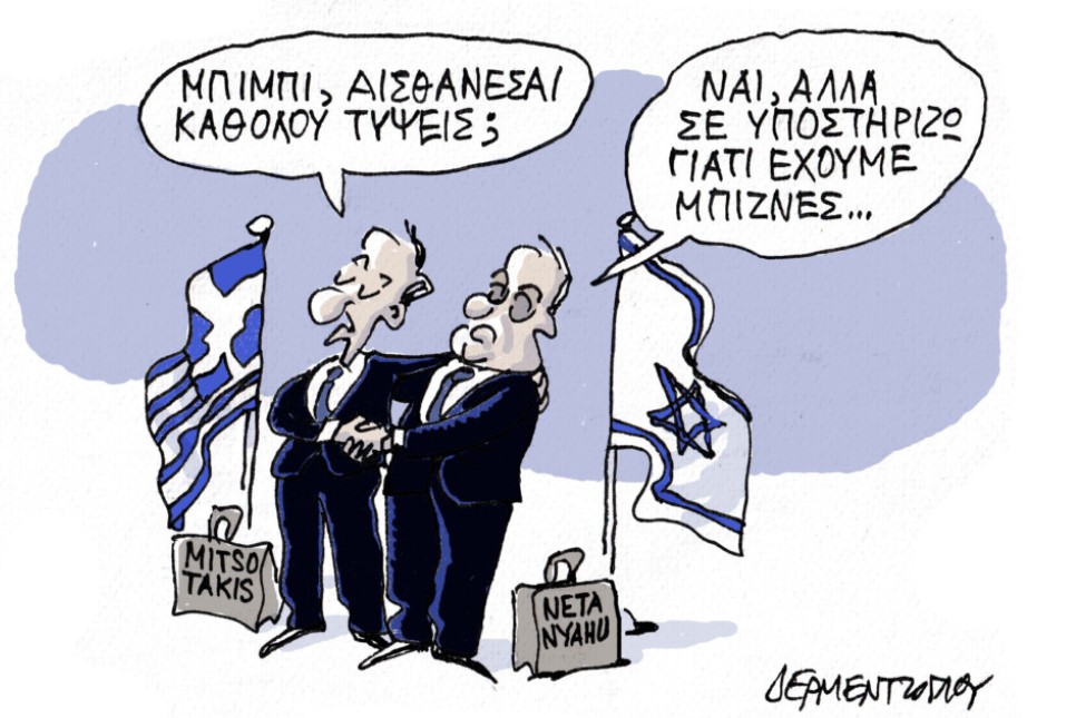 Η επιλογή της ελληνικής κυβέρνησης να παρέχει πλήρη και ανεπιφύλακτη στήριξη στο Ισραήλ (θλιβερή παραφωνία ακόμα και στην φιλοϊσραηλινή Ευρώπη) ας μη θεωρείται απλά γεωπολιτικός κυνισμός. Η στοίχιση με τους καταζητούμενους από το Διεθνές Δικαστήριο για εγκλήματα κατά της ανθρωπότητας έχει οσμή οικονομικής συναλλαγής. Αρκεί να θυμηθούμε τα νήματα που συνέδεαν τις ελληνικές υποκλοπές με το Ισραήλ, τα εξοπλιστικά και τα συστήματα ασφαλείας. Είναι πολλές οι μπίζνες και πολλά τα λεφτά.