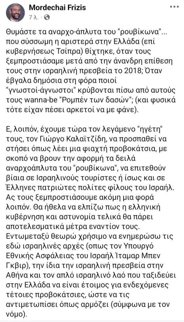 Επανερχόμαστε, λοιπόν στο θέμα γιατί τώρα ο ραβίνος Μορντεχάι Φριζή προβαίνει σε μια ανάρτηση – παραλήρημα με προφανή λόγο την κινδυνολογία. Τα ‘χει τόσο μπερδεμένα, που ενώ η παρέμβαση των μελών του «Ρουβίκωνα» κατά την οποία πέταξαν μπογιές στο κτίριο που στεγάζει την πρεσβεία, σε «ένδειξη αλληλεγγύης προς τον μαρτυρικό λαό της Παλαιστίνης», έγινε τον Δεκέμβρη του 2017 αυτός αναφέρει ότι πραγματοποιήθηκε το 2018.