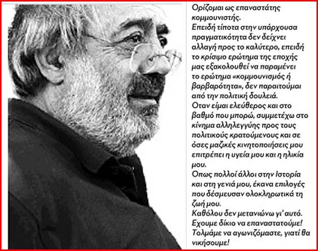 Δεν είμαι εγκληματίας για να απολογηθώ για κάτι. Βρίσκομαι κατηγορούμενος για την πολιτική μου δράση, που είναι ταυτισμένη με την ίδια τη ζωή μου. Μια δράση που ήταν στην υπηρεσία του Ελληνικού λαού και αυτός είναι ο μόνος αρμόδιος για να την κρίνει. Επομένως, δεν έχω να απολογηθώ για τίποτα σε ένα δικαστήριο της άρχουσας τάξης.