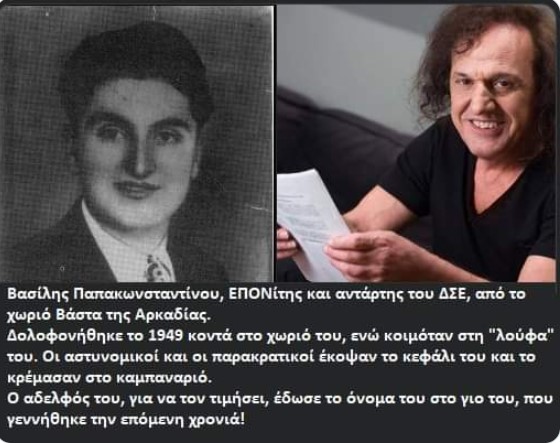 Η Ιστορία τηλεγραφικά: Ο Βασίλης Παπακωνσταντίνου ήταν διμοιρίτης του Αρχηγείου Μαινάλου του ΔΣΕ. Στις 12/10/1949 ένας χωριανός του χαφιές, τον εντόπισε όταν κάπου άραξε να ξεκουραστεί, και ειδοποίησε τους χωροφύλακες. Μιλιούνια απ’ αυτούς τον κύκλωσαν και τον σκότωσαν. Στην συνέχεια οι κανίβαλοι έκοψαν το κεφάλι του και το κρέμασαν στο καμπαναριό της εκκλησίας του χωριού Ίσαρι. (Διαβάστε αναλυτικά). Ο αδελφός του για να τιμήσει τον νεκρό αντάρτη έδωσε το όνομα στον γιό του που γεννήθηκε την επόμενη χρονιά.