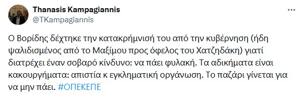 “Η ιδιότητα του υπόπτου τελέσεως αξιοποίνου πράξεως δεν συνάδει με την ιδιότητα του μέλους της Κυβερνήσεως”, έγραψε ο Μάκης Βορίδης στην επιστολή παραίτησής του.