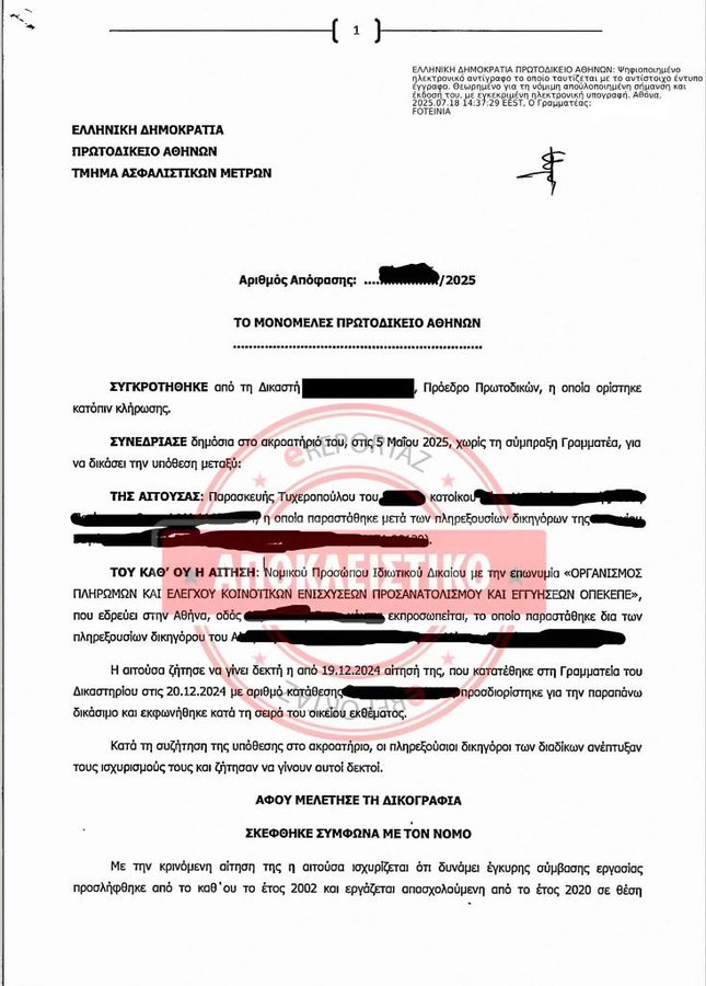 Πειθαρχική ποινή. Στέρηση μισθού. Κοινωνικός αποκλεισμός. Και τώρα, η Δικαιοσύνη σιωπά. Το Πρωτοδικείο Αθηνών απέρριψε την αίτηση ασφαλιστικών μέτρων της, αφήνοντάς την έκθετη σε ένα εκδικητικό και καταχρηστικό καθεστώς. Ετσι είχαμε την προκλητική δικαστική απόφαση η οποία απέρριψε τα ασφαλιστικά μέτρα της έντιμης υπαλλήλου κατά του υποβιβασμού μαι της απομόνωσης από το εργασιακό της περιβάλλον, που είχε λάβει ο διαβόητος πρώην πρόεδρος του ΟΠΕΚΕΠΕ Κυριάκος Μπαμπασίδης.