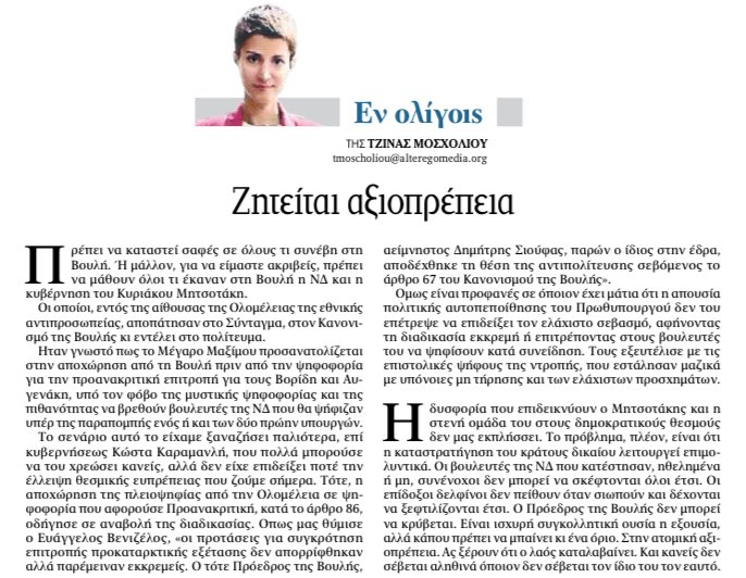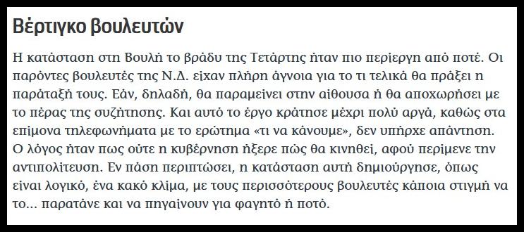 Και επί της ουσίας Η ΝΔ δεν έμεινε να ψηφίσει με φυσική παρουσία των βουλευτών γιατί η ηγεσία της έτρεμε την ιδέα ότι θα υπήρχαν διαρροές, πιθανόν και τόσες ώστε να έθεταν να ζήτημα δεδηλωμένης. Να σκεφτούμε πάντως ότι πριν λίγο καιρό φάνταζε αδιανόητο το να μην μπορεί ο πρωθυπουργός να ελέγξει τους βουλευτές του και η γραμμή απ’ το Μέγαρο Μαξίμου, απ’ ότι βλέπουμε στο σχόλιο της Καθημερινής να μην θυμίζει συγκροτημένο κόμμα, αλλά παρέα καφενείου που δεν έχει αποφασίσει πώς θα περάσει την βραδιά της.