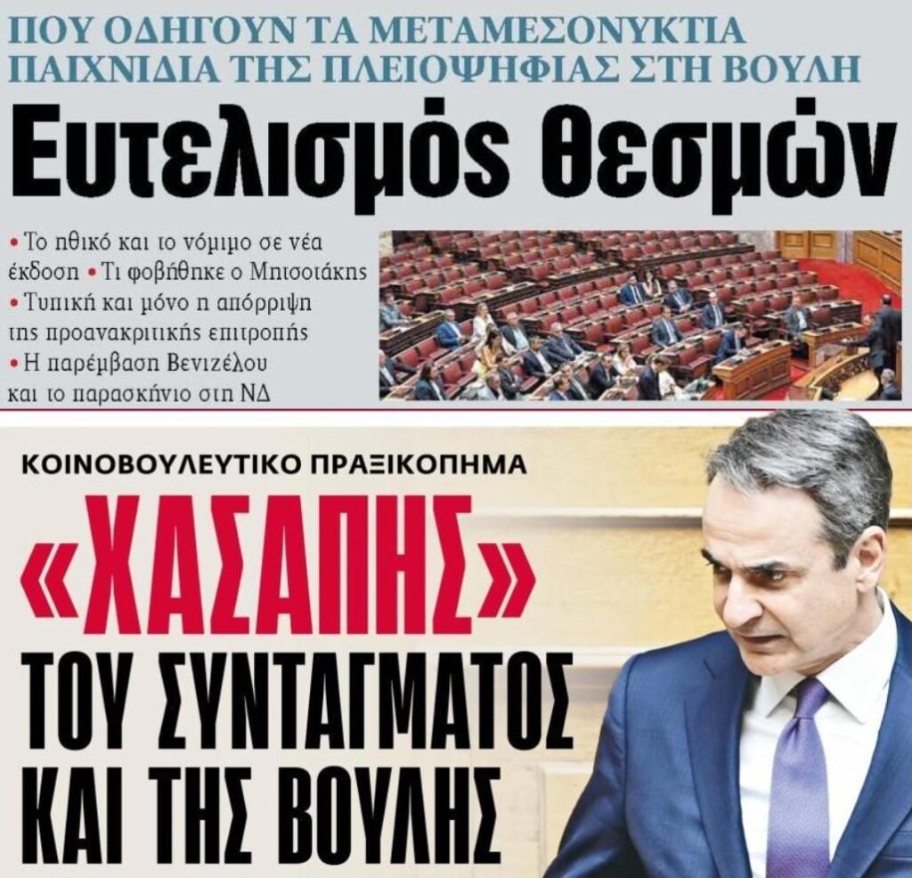 Είναι καθαρό εδώ και καιρό ότι η Ν.Δ, έχει ¨γραμμένα” Σύνταγμα και Θεσμούς. Πιο καθαρά απ’ όσο το είπε ο Αδωνις Γεωργιάδης δεν θα μπορούσε να το διατυπώσει: “Διαθέτουμε την απόλυτη κοινοβουλευτική πλειοψηφία και κάνουμε ότι γουστάρουμε“.