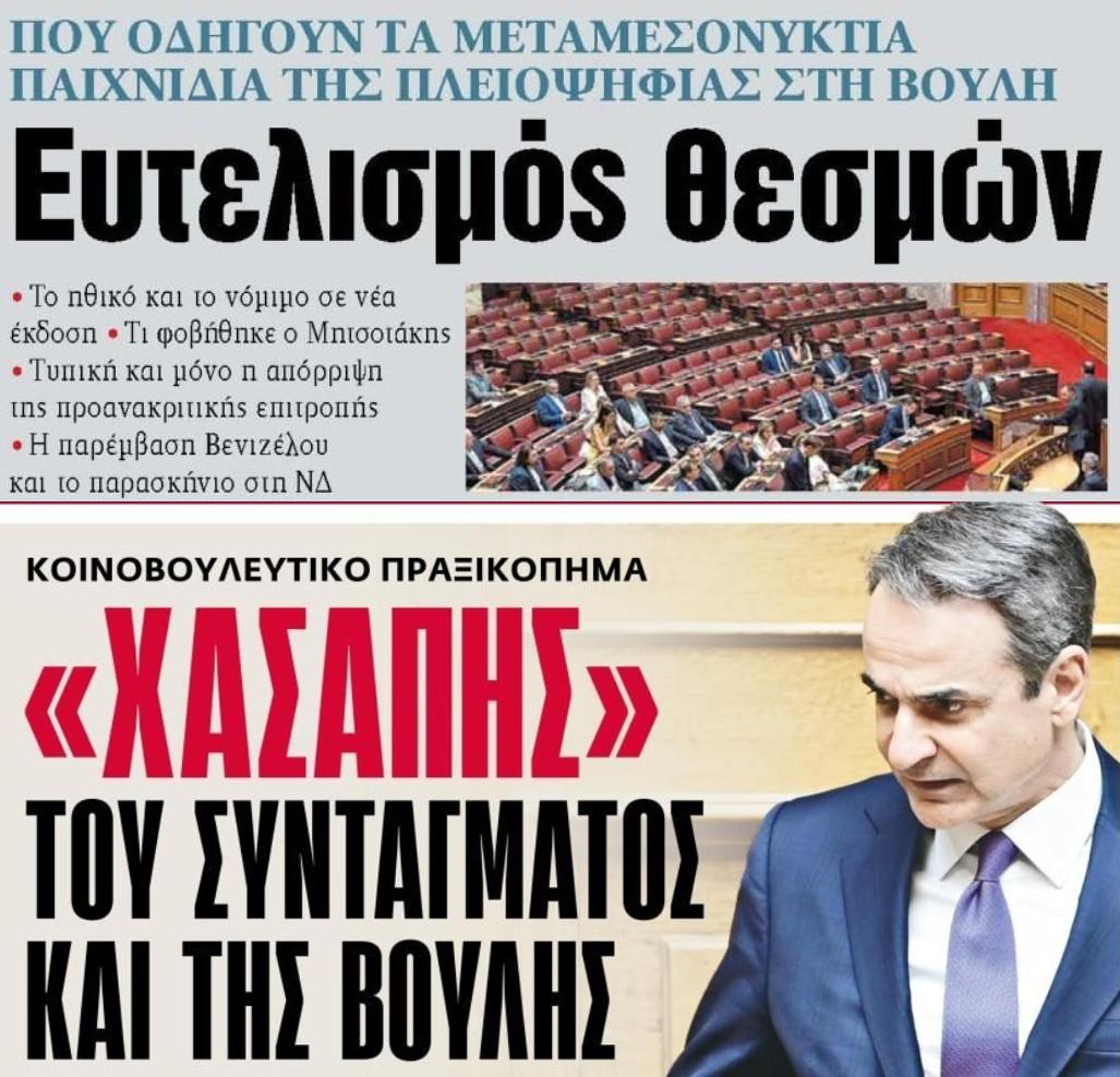 Η “Καθημερινή”, όπως βλέπουμε στο αρχικό καρεδάκι, γελοιοποιεί σήμερα την κυβερνητική παράταξη για την πρόσφατη στάση της στην βουλή. Στην ίδια περίπου κατεύθυνση αλλά με πολύ πιο καυστικό τρόπο που βάζουν στο στόχαστρο τους το ίδιο το Μέγαρο Μαξίμου κινούνται και τα σημερινά πρωτοσέλιδα των ΝΕΩΝ και της ΕΦΣυν.
