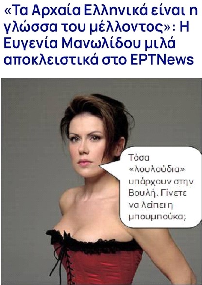 Στην Ελλάδα του 2025, που ζει την τεχνητή νοημοσύνη, την κοινωνική αποσύνθεση και τα ελλείμματα στην Παιδεία, υπάρχει ακόμα ένα σημείο ελπίδας: Η Ευγενία Μανωλίδου δήλωσε με στόμφο ότι «τα Αρχαία Ελληνικά είναι η γλώσσα του μέλλοντος».