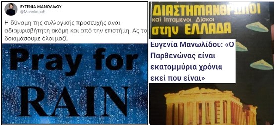 Η ίδια κυρία, ας μην ξεχνάμε, μας προέτρεψε πριν λίγο καιρό να «προσευχηθούμε όλοι μαζί για να βρέξει», διότι — όπως μας διαβεβαίωσε — η επιστήμη αναγνωρίζει πλέον τη δύναμη της συλλογικής προσευχής. Εδώ η κ. Μανωλίδου δεν μας αιφνιδίασε.