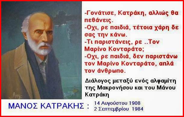 Ο διάλογος που διαβάζουμε στην αρχική εικόνα είναι μεταξύ του αλφαμίτη της Μακρονήσου και του Μάνο Κατράκη, ο οποίος πραγματοποιήθηκε την ώρα που το ένστολο κάθαρμα βασάνιζε τον εξόριστο κομμουνιστή. Αποκαλύπτει το μεγαλείο της συνείδησης του ανθρώπου που κάνει το χρέος του για το λαό του, έχοντας ακλόνητη πίστη στο δίκιο του.