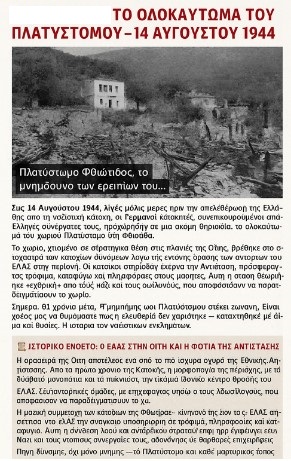 Στις 14 Αυγούστου 1944, λίγες μόλις μέρες πριν την απελευθέρωση της Ελλάδας από τη ναζιστική κατοχή, οι Γερμανοί κατακτητές, συνεπικουρούμενοι από Έλληνες συνεργάτες τους, προχώρησαν σε μια ακόμη θηριωδία: το ολοκαύτωμα του χωριού Πλατύστομο στη Φθιώτιδα.