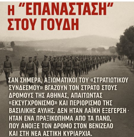 Σαν σήμερα, αξιωματικοί του «Στρατιωτικού Συνδέσμου» βγάζουν τον στρατό στους δρόμους της Αθήνας, απαιτώντας «εκσυγχρονισμό» και περιορισμό της βασιλικής αυλής. Δεν ήταν λαϊκή εξέγερση· ήταν ένα πραξικόπημα από τα πάνω, που άνοιξε τον δρόμο στον Βενιζέλο και στη νέα αστική κυριαρχία. Ο εκσυγχρονισμός τους σήμαινε στρατιωτικοποίηση, φοροληστεία και ετοιμασία για πολέμους – όχι ανακούφιση για τον λαό.