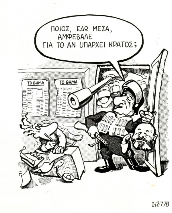 Εδώ τελειώνει το άρθρο. Να προσθέσω ότι μια-δυο μέρες αργότερα, ο Γιάννης Ιωάννου, που τότε ήταν ο γελοιογράφος του Βήματος, δημοσίευσε (πιθανώς όμως όχι στο Βήμα αλλά στο Αντί) την εξής εξαιρετική γελοιογραφία που δεν ξέρω αν προσπαθούσε να αθωώσει την εφημερίδα, ούτε αν τα κατάφερνε:
