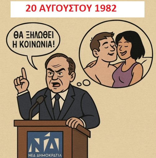 Σαν σήμερα, 20 Αυγούστου 1982 (ΦΕΚ Α’ 97/20-8-1982), καταργήθηκε η διάταξη του Ποινικού Κώδικα που ποινικοποιούσε τη μοιχεία. Όλες οι σχηματισμένες δικογραφίες αρχειοθετήθηκαν και οι καταδικαστικές αποφάσεις διαγράφηκαν από τα ποινικά μητρώα. Υπέρ ψήφισαν ΠΑΣΟΚ και ΚΚΕ. Η τότε Ν.Δ. αντέδρασε λυσσαλέα, αφήνοντας στα πρακτικά μερικά ανεπανάληπτα «μαργαριτάρια».