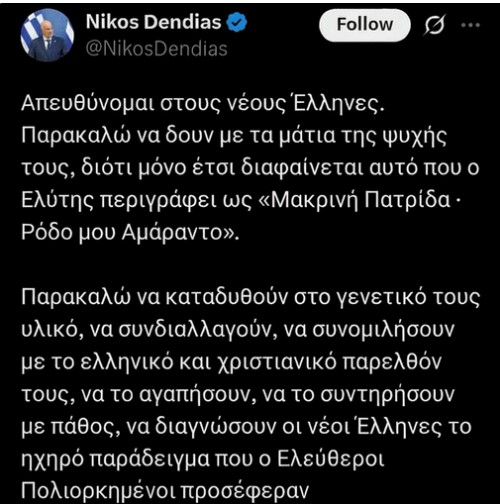 Ο υπουργός Εξωτερικών, ναι αυτός που υποτίθεται κινείται σε ευρωπαϊκά σαλόνια και μιλά για διεθνές δίκαιο, ξαφνικά μας καλεί να βουτήξουμε στο «γενετικό μας υλικό», να συνομιλήσουμε με το «ελληνικό και χριστιανικό παρελθόν» και να κοιτάξουμε με τα «μάτια της ψυχής» την πατρίδα. Όχι, δεν πρόκειται για ανέκδοτο του Σεφερλή. Είναι επίσημο tweet.