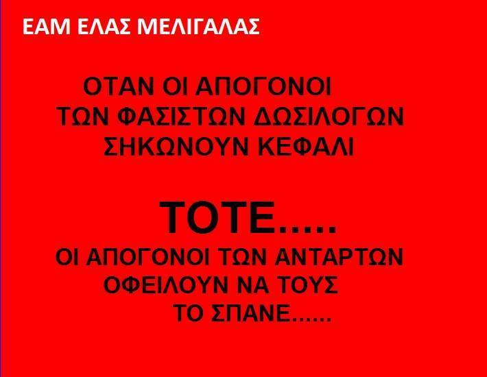Γυρεύοντας πάνε τα γαλάζια μπάσταρδα του Χανς του γκεσταπίτη και της γίδας Κανούτας που προσπαθούν να τσουβαλιάσουν τους ναζί εγκληματίες με τους Κομμουνιστές ήρωες. Ας ρωτήσουν τους παππούδες και τους πατεράδες τους. «Με ποιους ήσασταν στην Κατοχή;» Με το Χίτλερ ήταν και πολεμούσαν τους Κομμουνιστές. Εμείς είμαστε υπερήφανοι για τους δικούς μας, που αντιστάθηκαν στους κατακτητές. Για πείτε για τους δικούς σας νεοδημοκρατικά αποβράσματα. Πόσοι προδότες πήγαν στην ΕΡΕ και μετά στη ΝΔ; Έχουμε γράψει σχετικά. Να τα λέμε πάλι, γιατί τα φιδάκια ξεθαρρεύουν, όταν νομίζουν πως ξεχνάμε.