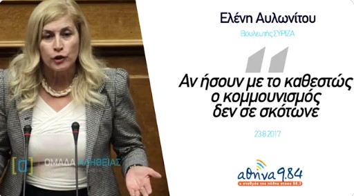 Άλλο που δεν ήθελε η νεοδημοκρατική ομάδα αλητείας για να στήσει πανηγύρι προπαγάνδας. Σήμερα η βουλευτής του ΣΥΡΙΖΑ, Ελένη Αυλωνίτου, μιλώντας στον ραδιοσταθμό «984», έκανε μια απίθανη δήλωση: ότι «οι κομμουνιστές δεν σκότωναν ανθρώπους γιατί ήταν μαύροι, τσιγγάνοι ή ομοφυλόφιλοι όπως κάνουν οι ναζιστές».