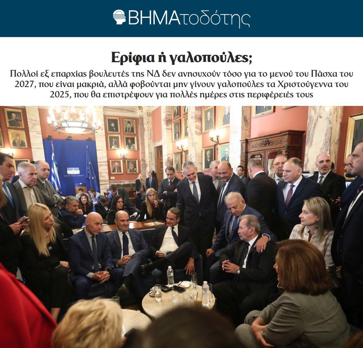 Στη συνάντηση ο Κυριάκος Μητσοτάκης έκανε χιούμορ για τον χρόνο -και το αποτέλεσμα- των εκλογών, λέγοντας ότι «το θέμα είναι ποιος θα σουβλιστεί το Πάσχα του 2027», αλλά βουλευτής της ΝΔ μου είπε ότι πολλοί εξ επαρχίας συνάδελφοί του δεν ανησυχούν τόσο για το μενού του Πάσχα του 2027, που είναι μακριά, αλλά φοβούνται μην γίνουν γαλοπούλες τα Χριστούγεννα του 2025, που θα επιστρέψουν για πολλές ημέρες στις περιφέρειές τους.