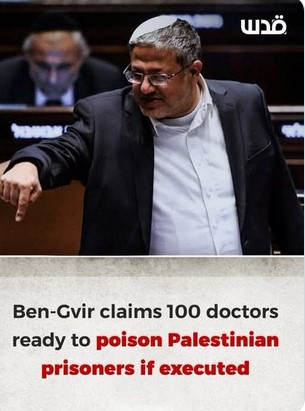 Αυτή την εβδομάδα, ο ακροδεξιός υπουργός Εθνικής Ασφάλειας Ιτάμαρ Μπεν‑Γκβιρ (Itamar Ben-Gvir), εμφανώς περήφανος, ανακοίνωσε δημόσια ότι έχει λάβει «100 τηλεφωνήματα από γιατρούς που λένε: “Ιτάμαρ, πες πότε — είμαστε έτοιμοι να το κάνουμε”» για να εκτελέσουν με θανατηφόρες ενέσεις παλαιστίνιους κρατούμενους, εφόσον νόμος που προβλέπει την εκτέλεση εγκριθεί. (Πηγή).