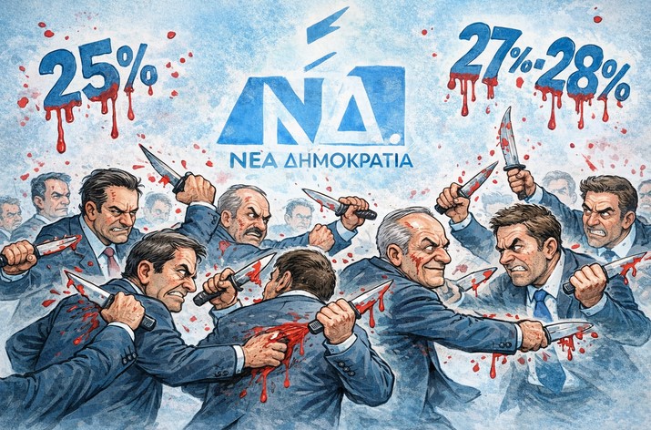 Κάτω από 25% στην Ν.Δ., πολιτική σφαγή, διάλυση συνοχής, εμφύλιος χωρίς επιστροφή. 27–28%: προσωρινή ανάσα, αλλά τα εσωτερικά αλληλομαχαιρώματα θα δώσουν και θα πάρουν.
