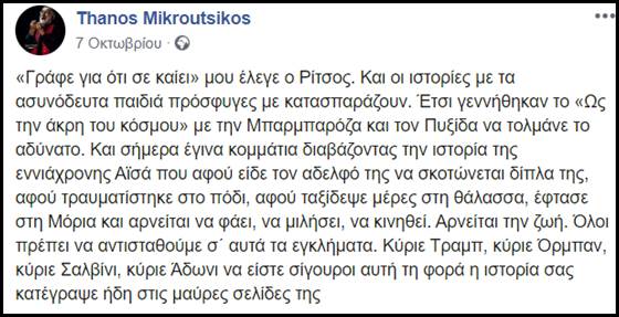 Σε μια εποχή που οι Πλεύρηδες με τον ακροδεξιό τους συρφετό θέλουν ο στρατός, το ναυτικό και οι συνοριοφύλακες να πυροβολούν και να σκοτώνουν όποιον ξεριζωμένο απ’ την πατρίδα του προσπαθεί να ρθει στην χώρα μας, η παρακαταθήκη που μας κληρονόμησε με τα τραγούδια του, τον τρόπο ζωής του, αφήνοντας βαθιά τα χνάρια του στην πολιτιστική ζωή της χώρας, o Θάνος Μικρούτσικος, είναι ανεκτίμητη.