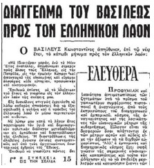 Ομως, όπως φάνηκε και παρά τις διαβεβαιώσεις του -εκλεκτού των Ανακτόρων- πρωθυπουργού ότι είχε γνώση του κειμένου, ο νεαρός βασιλιάς είχε κινηθεί αυτοβούλως αγνοώντας ακόμα και την κυβέρνησή «του».
